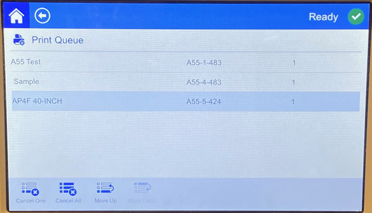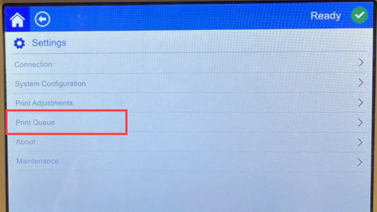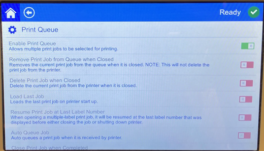 - Auto Queue Job: Turn this on to automatically add jobs to the print queue when they are sent to the printer. If this is off, then you have to use the Print Jobs button on the home screen to add jobs to the queue.