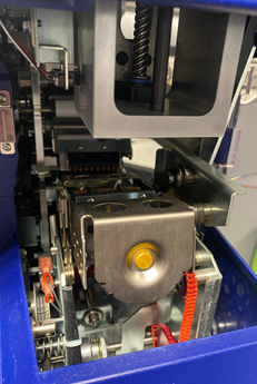 - On the back of the flagger assembly, push the black bar (spring-loaded slide) forward to expose the (yellow) head of the retaining post.