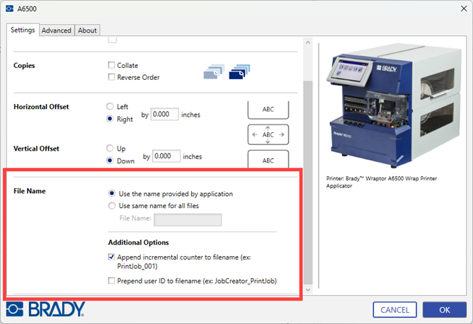 Both the A6200 and A6500 printers offer two primary file naming options: "Use the name provided by the application" or "Use the same name for all files." Only one of these options can be selected. The key difference is that the A6200 also provides the ability to prompt for a filename at print time.