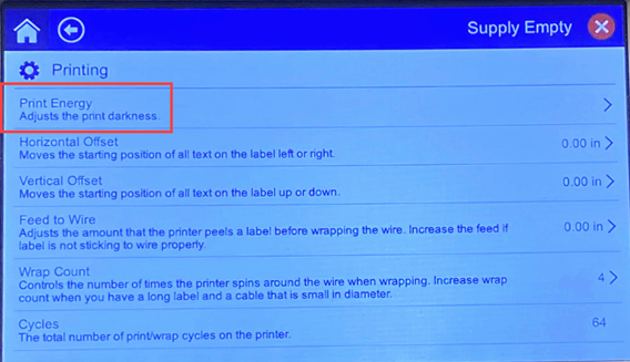 By default, Brady materials are programmed with the corresponding print energy for the label and ribbon. The Print Energy can be increased or decreased. The print energy will apply more heat and potentially transfer more ink onto the label. This can be done, however, it will wear through the printhead faster.