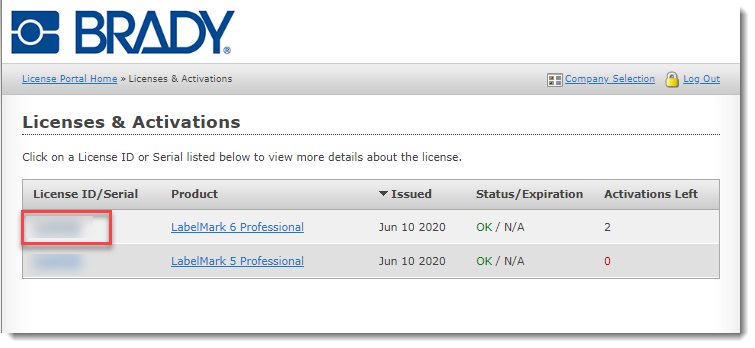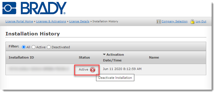 Note: If you do not see the red X, or the license shows it is already deactivated with 0 activations, contact Brady Technical Support for your region to have the license reset: Global Brady Technical Support Contact Information.This will increase your activation count by 1. You can now activate the software on a new PC using your License ID and Password.