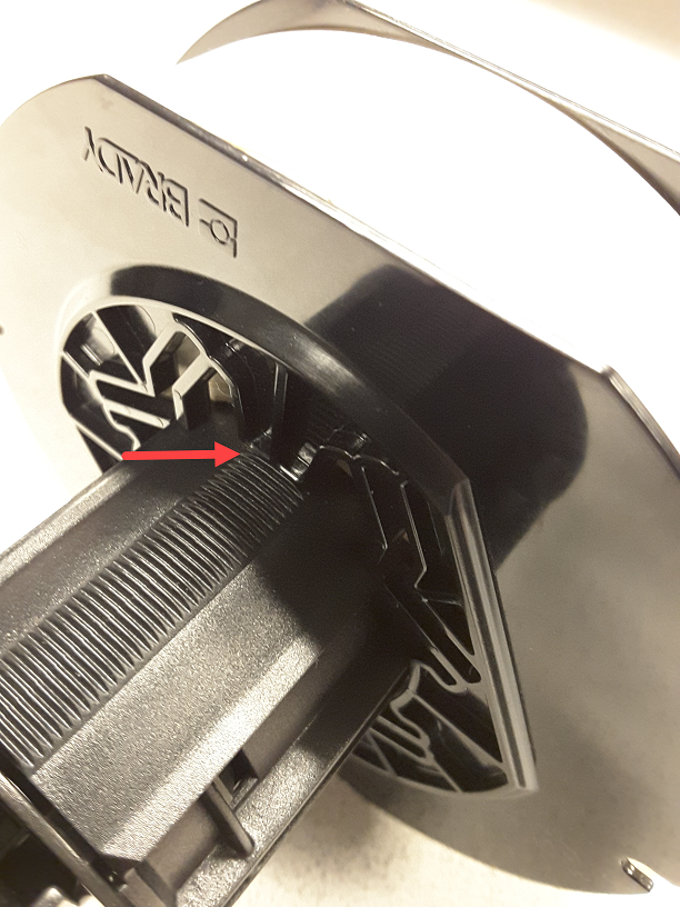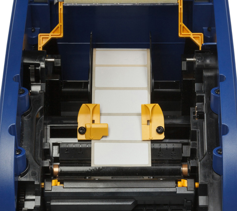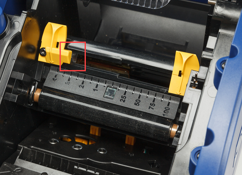 Check to confirm the media roll is centered on the spool. In some instances customers reported the label roll was not aligned to the center of the plastic spool. Each label roll support has two tabs that can be adjusted to accomplish moving the whole roll over if necessary. Each side/support has to be manipulated separately. Tilting and pressing the support at a slight angle to “click” into the next notch(es) requires a bit of careful pressure but it can be done. It’s easier to move them one direction than the other (easier to move them toward the end of the spool than toward the center).