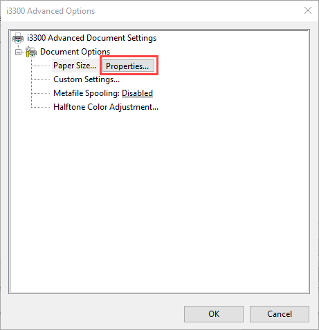 - Select Paper Size and select the Properties button.