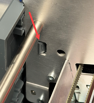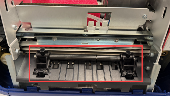 - Once the cover is removed, there are two tabs for the eject roller. Verify the eject roller is seated properly and is not sticking up.