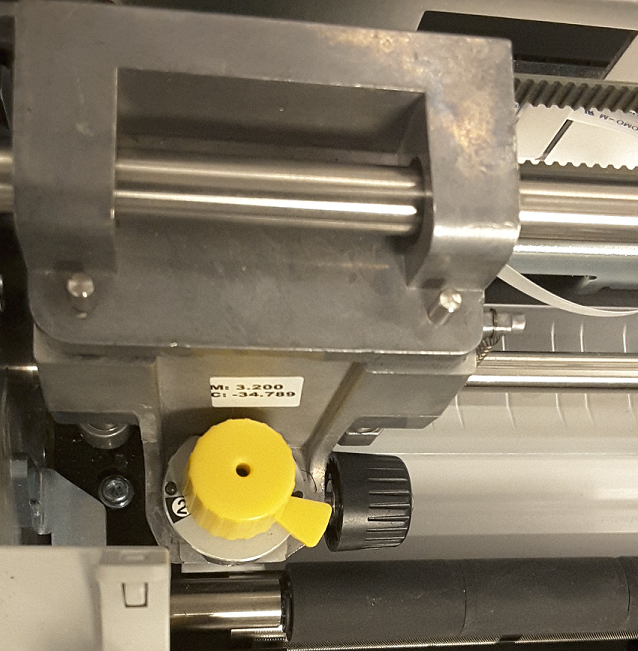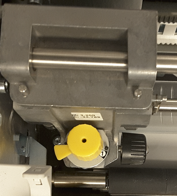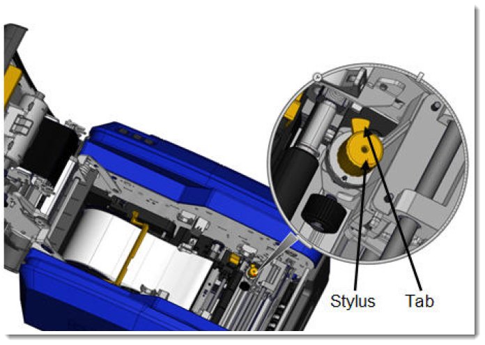 Looking into the printer from the side of the cover latch, the yellow stylus used for adjusting the blade height is located on the right side of the printer.
