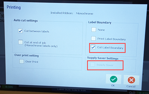 - Ensure Cut Label Boundary and Supply Saver options are checked. If you have a single color or monochrome ribbon installed the Supply Saver feature will be grayed out and does not need to be selected. Select OK on the next couple of windows to get back to the label editor screen.