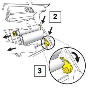 Place the left side of the media roll insert over the yellow drive cone, pull toward left, then insert the end of the roll over the opposite drive cone (4).