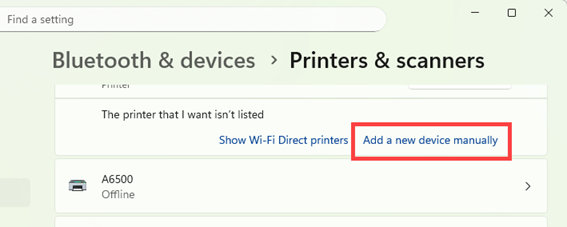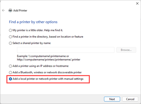 1. Click the radio button for Add a local printer or network printer with manual settings.