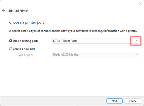 1. Plug in the printer using the USB cord. Verify the Use an existing port radio button is selected and find the printer in the list.