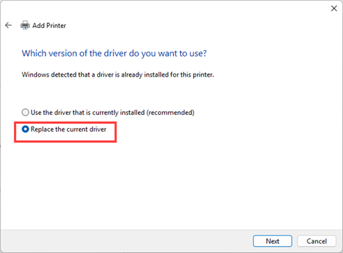 1. If asked which version of the driver you want to use, select Replace the current driver and click Next.