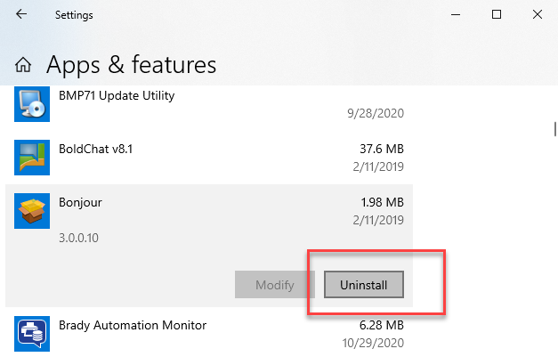 Body | IssueDuring installation or removal of Brady Workstation, the software gives an error "A program is still running"CauseThis is usually caused by the Bonjour process. As of Brady Workstation shell version 4.11 (Winter 2020 release), Apple's Bonjour print service is installed as part of Brady's networking solution for Direct Print Printers. Resolution1. Open Task manager and stop the Bonjour program. 2. Navigate the start menu, type "programs" and open Apps and Features. Find Bonjour and uninstall it. 3. Now try removing or installing Brady Workstation. A restart of your PC may be required. |