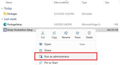 1. Right-click the Brady Workstation Setup.exe file and select Run as administrator