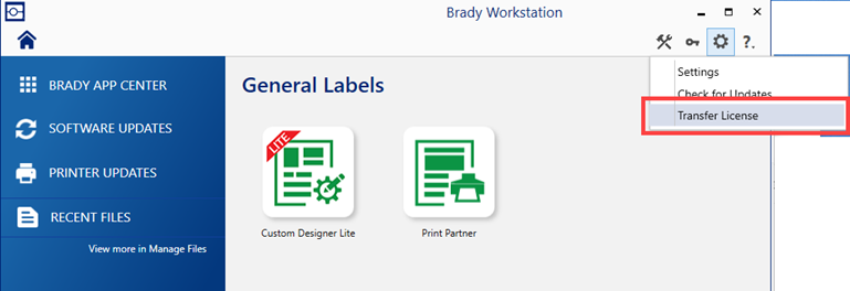 - Launch Brady Workstation from the original licensed computer. Click the gear icon and choose Transfer License.