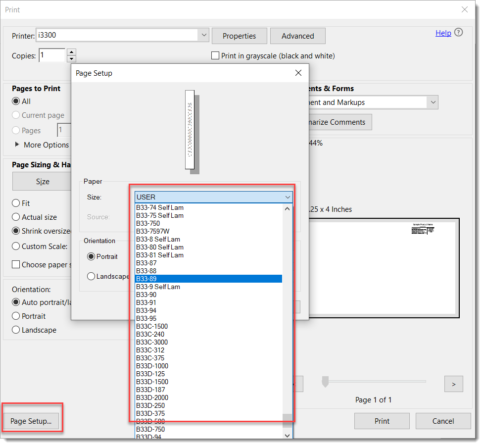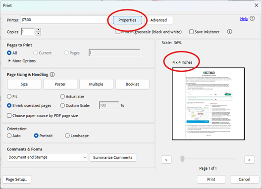 - Open the Adobe Acrobat print dialog and select your printer. Note the default label size.
