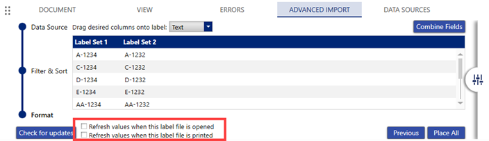 If the Refresh values when this label file is printed checkbox is checked, the software will automatically look at the file once Print is clicked. Any updates will display on the Print Preview page.