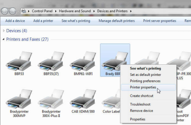 1. Navigate to Start Menu > Control Panel > View Devices and Printers. 2. Right click the BBP12 driver and choose "Printer Properties".