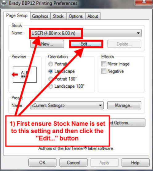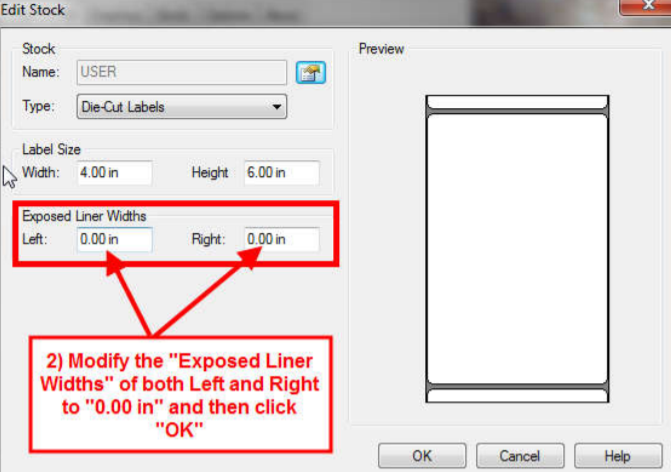 5. After selecting to “Edit Stock”, ensure the Left/Right values are modified as noted below.