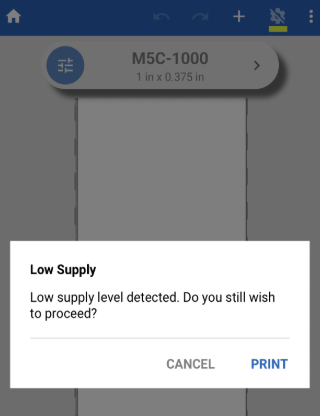 This is just a warning message when the materials get to 15% or less. Click Print to bypass the message to continue to print or Cancel to cancel the request.