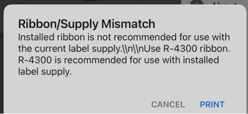 Tap Print to bypass the error and print or Cancel to cancel the print job to change the installed ribbon.