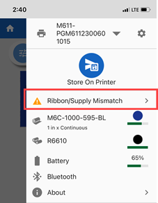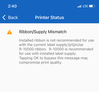 Ribbon/Supply Mismatch displays in the Express Labels app.