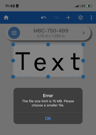 "The file size limit is 15 MB. Please choose a smaller file." displays in the Express Labels app. The "Error processing image. Please try again." displays after the File size error.