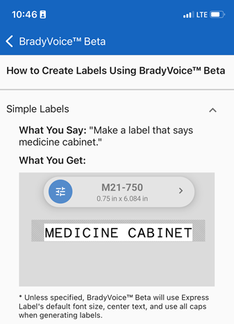 If examples of BradyVoice are needed: tap the menu icon (three bars) > BradyVoice Beta > How to Create Labels Using BradyVoice Beta > tap the specific label to view the instructions.