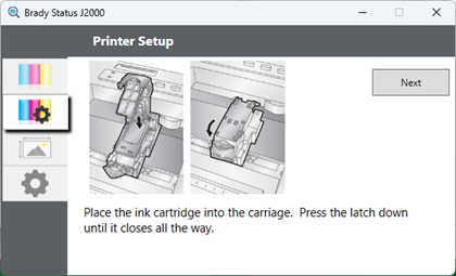 Place the ink cartridge into the carriage and press the latch down. Click Next.