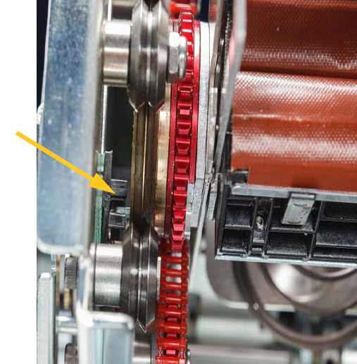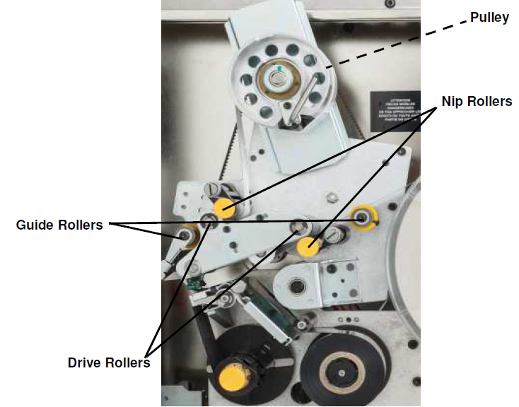 Nip rollers are steel with yellow knobs. They add pressure to the drive rollers to keep the label material
