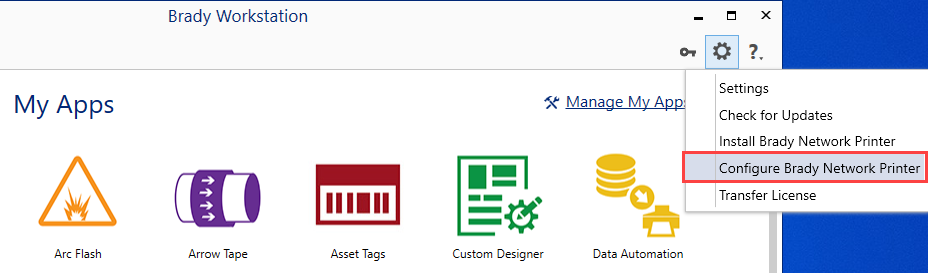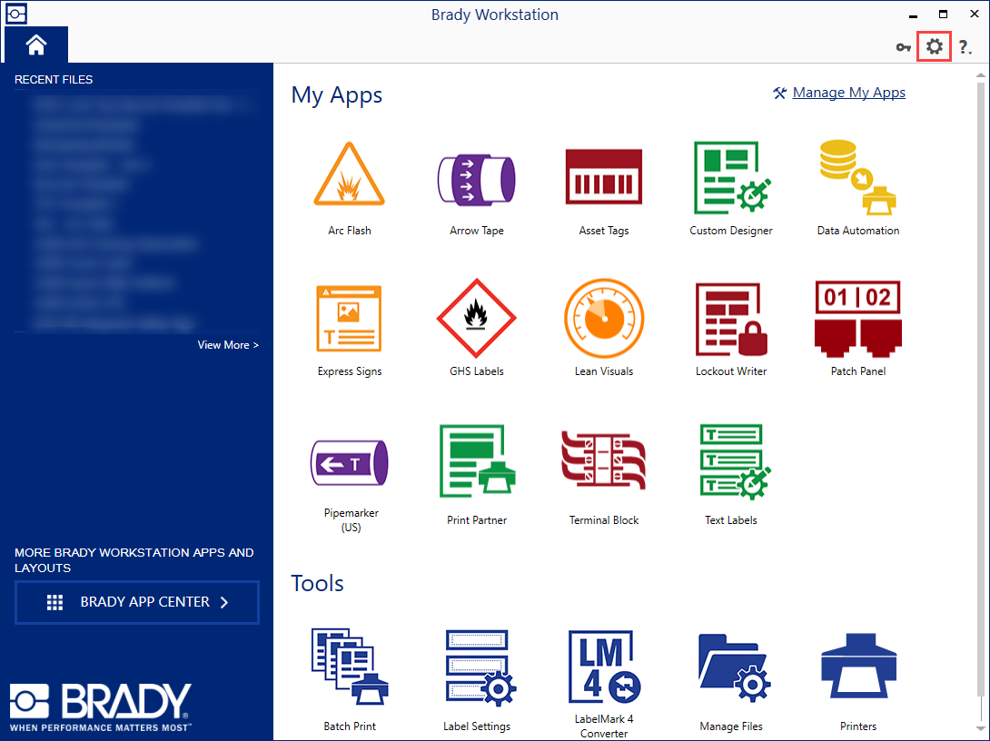 - Launch Brady Workstation and select the gear icon in Brady Workstation.