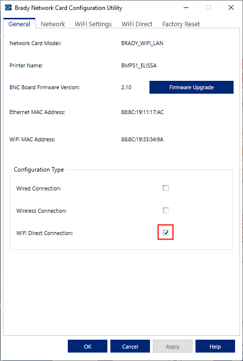 WiFi Direct allows the printer to communicate directly with the wireless network adapter of a PC or mobile device. Configuration via Brady Workstation only needs to be performed for first-time setup. A USB connection is not necessary when connecting via WiFi Direct to additional devices.