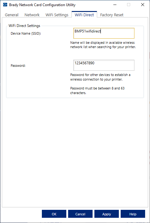 - Select the WiFi Direct tab to configure the printer SSID and password. Select Apply and then select OK.