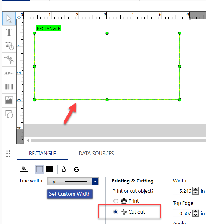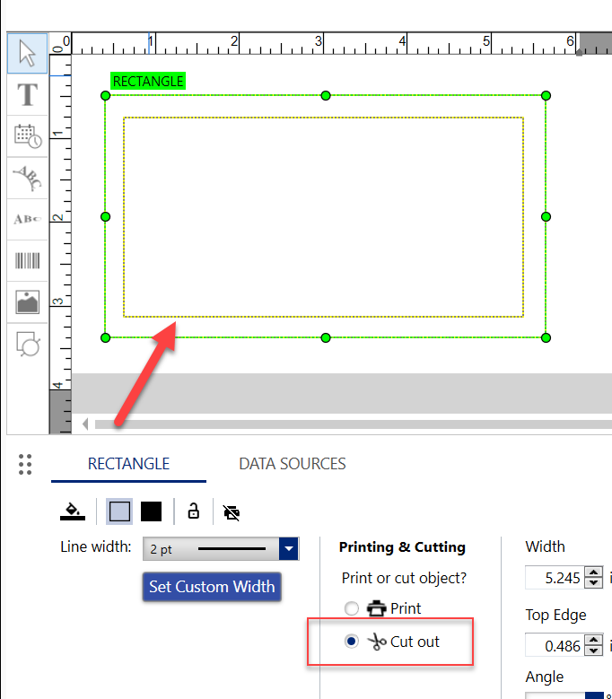 Body | Am I able to increase the size of the area to cut out?The size and thickness of the cut out object and area cannot be directly increased. In order to accomplish this, add another cut out shape to create the desired thickness.Note: Cutting out shapes and text is only possible with the BBP37 and S3700 printer using compatible 4" label material. For more information see: What Materials Work with the BBP37 and S3700 Plotter Cutter?.