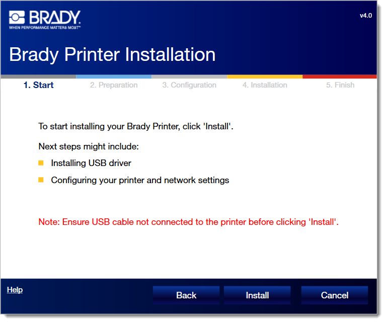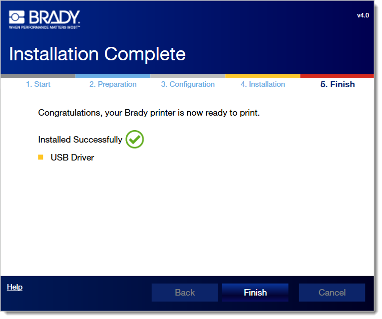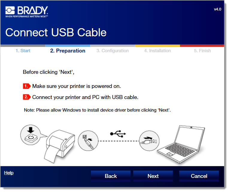 Note: If you connected the USB cable before step 7, you get a "checking printer status failed" error. Reference this article to resolve - Brady Printer Drivers - Checking Printer Status Failed