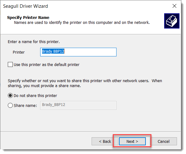 Note: If prompted to upgrade drivers for other printers, deselect this option for the BBP72, i5100, i7100, PR and IP Series printers. These models will typically use Brady drivers for Brady and Seagull Scientific software (Bartender). If you select this option, those Brady drivers will be replaced.