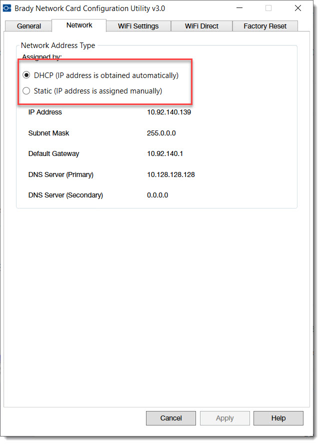 The Brady Network Card (BNC) is an optional accessory for the BMP51 and BMP53 printers. Configuring the network card requires the printer be simultaneously connected to the network via ethernet and PC via USB. This article covers configuring the printer to use a static or DHCP hard line (ethernet) network connection.