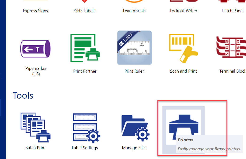 1. Launch Brady Workstation and select the Printers app.