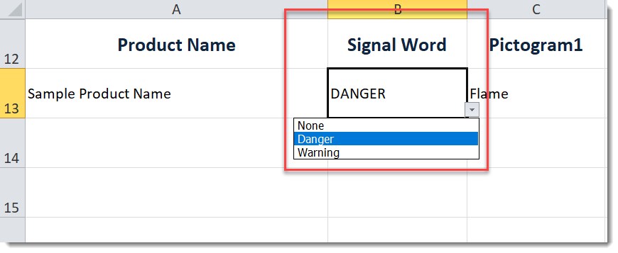 2. Signal Word must be selected from a list. Leave the cell blank for no signal word. To fill it in, click the cell, then click the down arrow next to the cell and select the correct signal word.