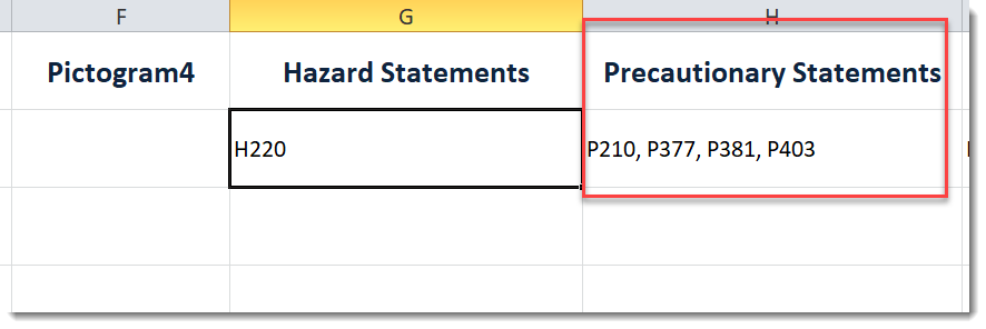 A chemical may have multiple hazard statements and precautionary statements. Because all data for one chemical must be in the same row, multiple statements must be entered in one cell. Statements are comprised of a code (such as P103) followed by a phrase (such as Read label before use). Most of these codes and phrases are standardized, so if you enter just the code or just the exact phrase, the software can fill in the entire statement for you.