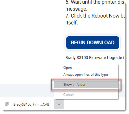 - Download the latest version of the Firmware from BradyID and locate the .CAB upgrade file on your PC.
