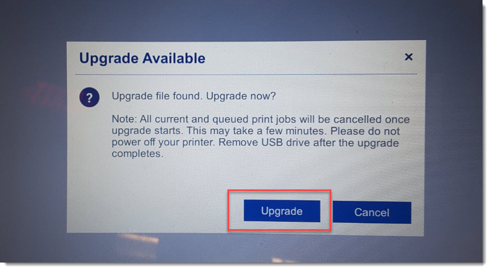 - Follow the instructions on the touch screen. When the upgrade is complete, the printer restarts.