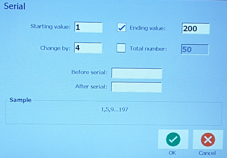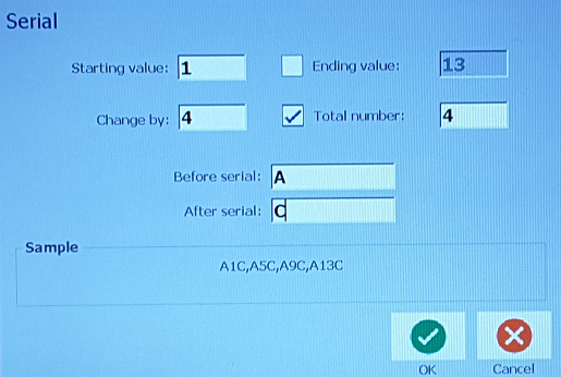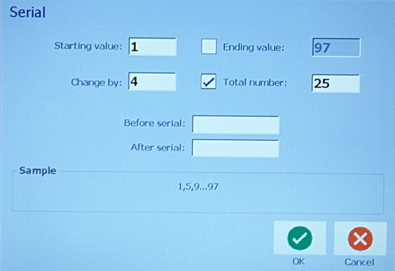 Serialization consists of a Start Value, End Value, and Increment (Change by). The Start Value is the number, letter, or combination of numbers and letters that begin the serialization sequence. The End Value is the termination point of the sequence.