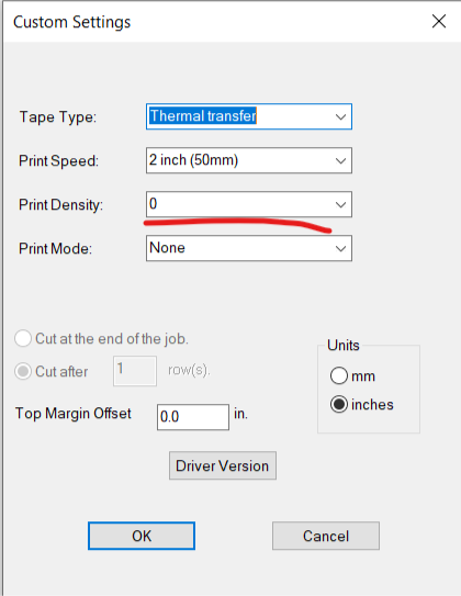 - Select General tab > Preferences > Advanced > Custom Settings Properties > Print Density to increase heat level.