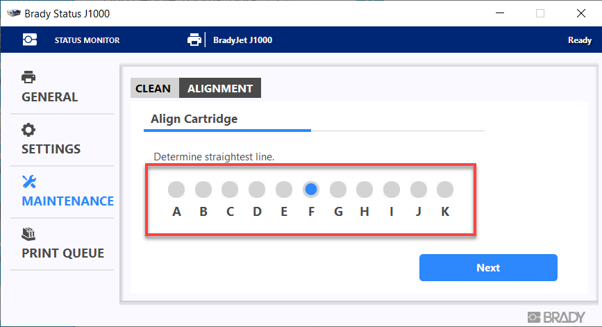 7. In Status Monitor, click the letter corresponding to the straightest line (F in our example) and then click Next. 8. Load another piece of paper and click Print to print another alignment test. Verify that all the lines are straight.