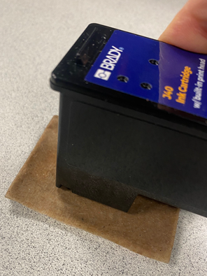 - Unfold the second paper towel, place on a flat/hard surface and press the cartridge, nozzle side down, on to the top edge of the paper towel.