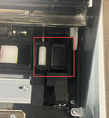 - Gently move the cartridge carrier to the left to access the maintenance station. The maintenance station is located on the right side of the print area and includes the rubber cartridge nozzle cap and the plastic roller.