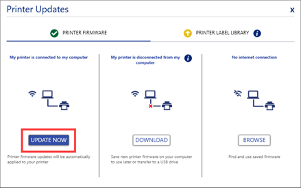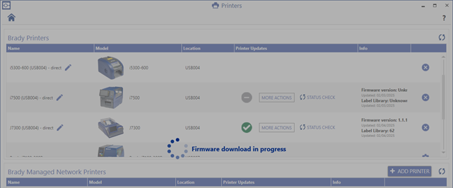 Firmware can only be updated in Brady Workstation if the current firmware on the printer is version 1.1 or later.