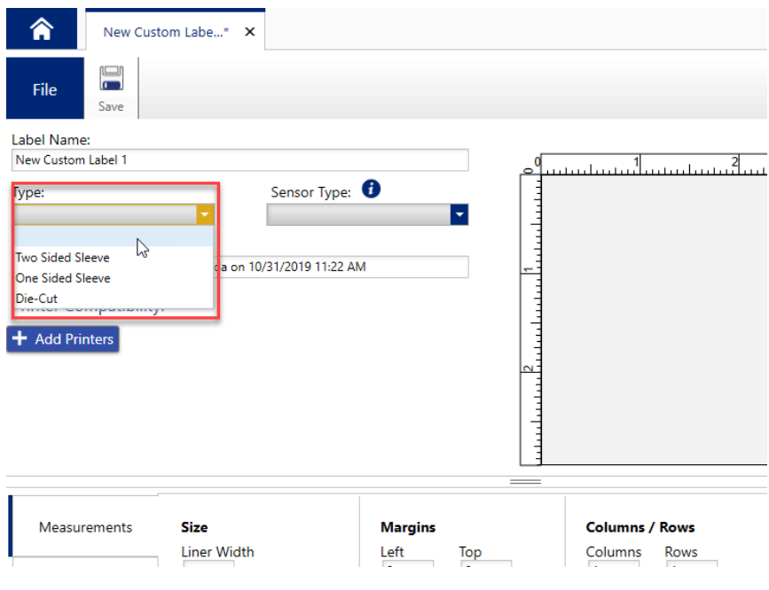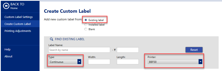 Select the "From Existing Label" option to configure a continuous custom part. Be sure to select Continuous as the Type, and your printer model under printer to find a stock continuous label for your printer to modify to your custom label's dimensions.