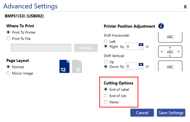 NOTE: If Cut At End of Label is not selectable, it is because the label is not at least 0.6" long. If label length or auto-calculated length is 0.5" or less, it will not allow you to cut after label, only after job. This is because of the distance from the printhead to the cutter. If 0.5" or less, the cut label might fall into the printer, causing material jams or damage to printer.