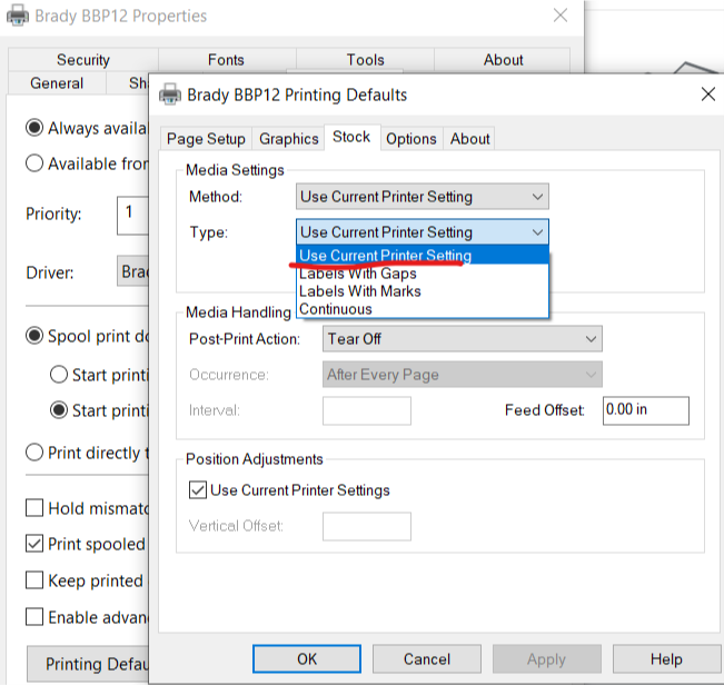 - If the printer is still having issues and displaying the message, reset the printer using the diagnostics tool: BBP12 - Reset to Factory Defaults. After resetting the printer, set the printer to User in the Driver.