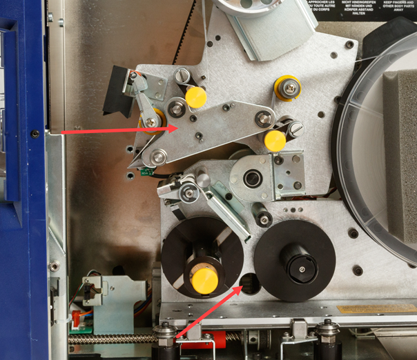- Manually shuttle the slide track forward until the back inside oiler is exposed. The back oiler can be accessed underneath the print and wrap mechanism towards the back.